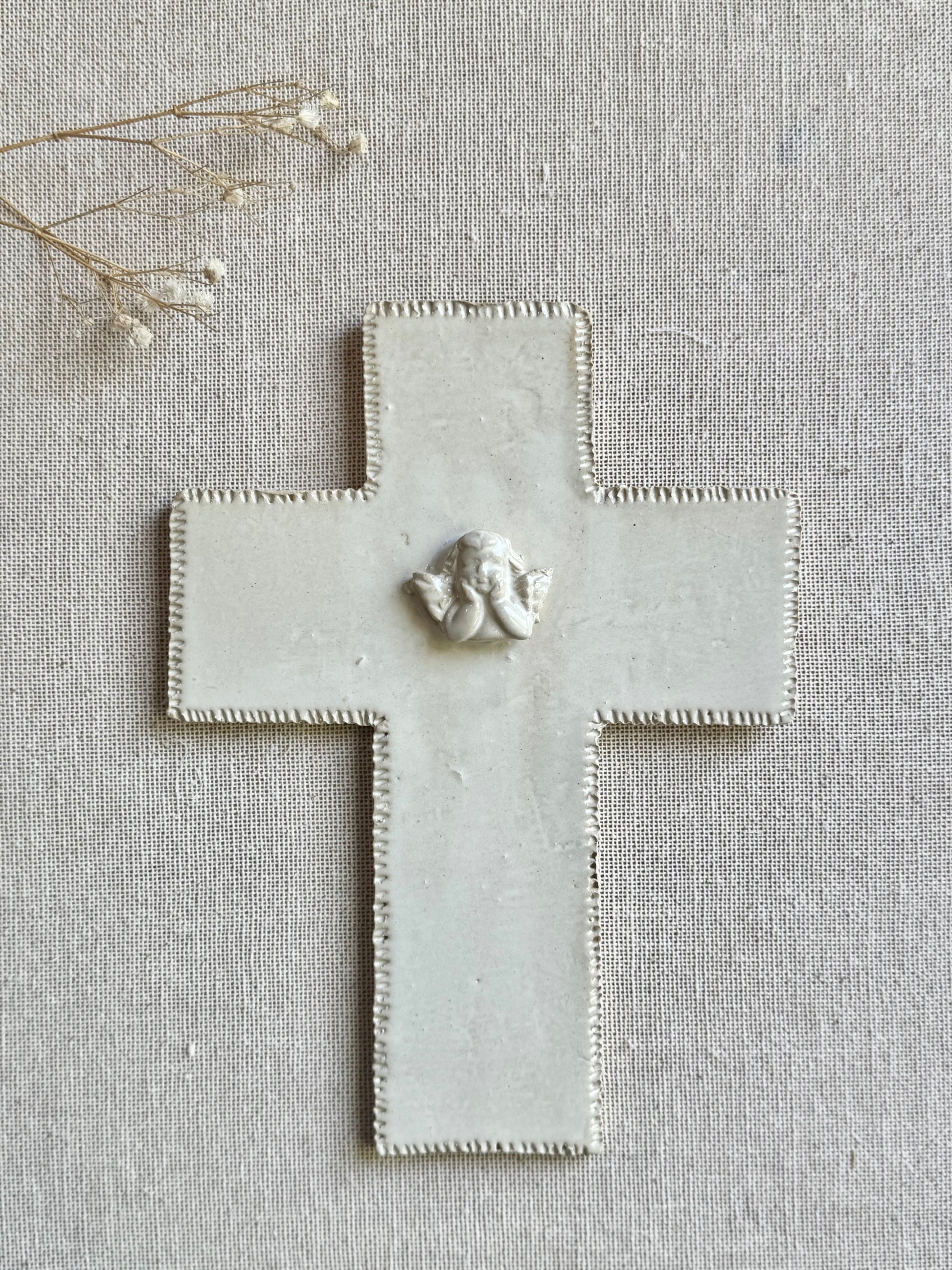 Cruz de cerámica gres hecha a mano. Mide aproximadamente 20 cm de largo e incluye un empaque de regalo.