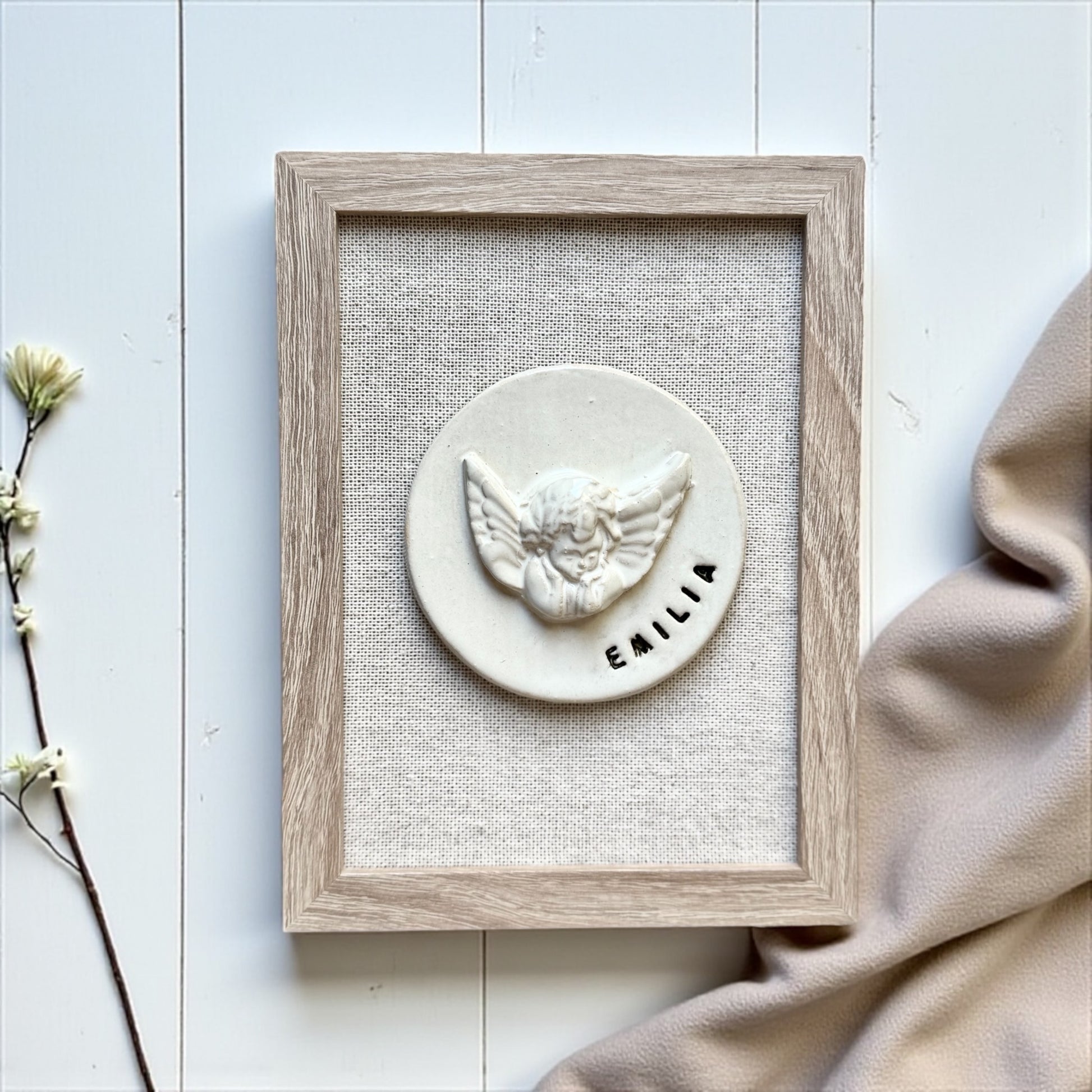 Un detalle único para tu hogar o para regalar. Cada cuadro incluye una figura de cerámica gres hecha a mano sobre fondo de lino beige, logrando un estilo simple y elegante que combina con cualquier espacio.