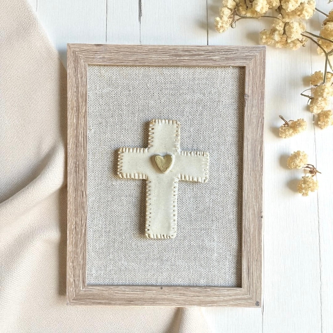 Un detalle único para tu hogar o para regalar. Cada cuadro incluye una figura de cerámica gres hecha a mano sobre fondo de lino beige, logrando un estilo simple y elegante que combina con cualquier espacio.