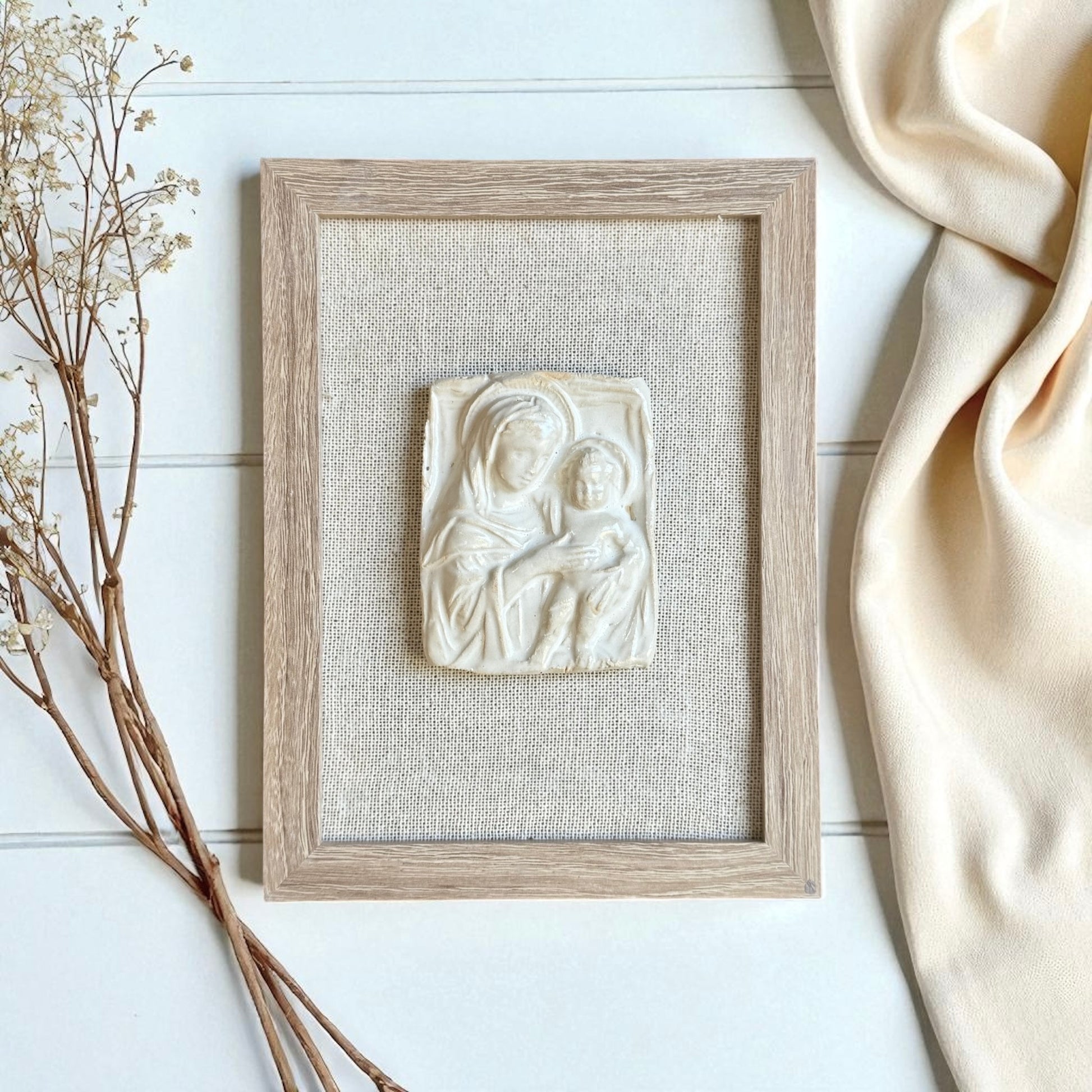 Un detalle único para tu hogar o para regalar. Cada cuadro incluye una figura de cerámica gres hecha a mano sobre fondo de lino beige, logrando un estilo simple y elegante que combina con cualquier espacio.