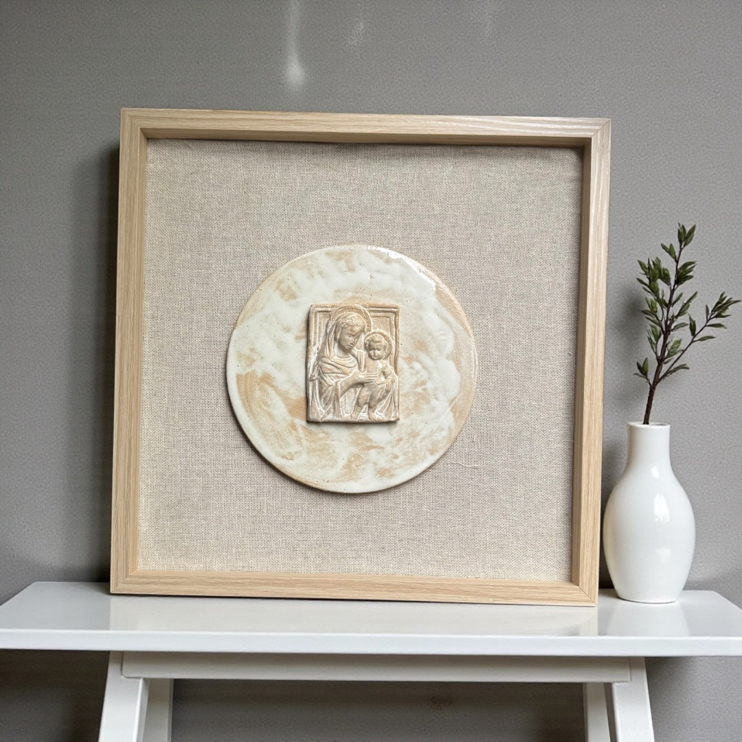 Un detalle único para tu hogar o para regalar. Cada cuadro incluye una figura de cerámica gres hecha a mano sobre fondo de lino beige, logrando un estilo simple y elegante que combina con cualquier espacio.