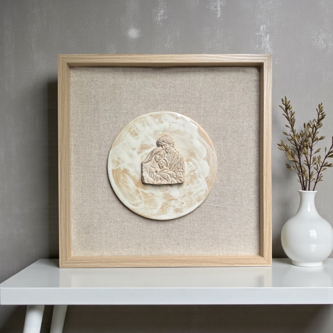 Un detalle único para tu hogar o para regalar. Cada cuadro incluye una figura de cerámica gres hecha a mano sobre fondo de lino beige, logrando un estilo simple y elegante que combina con cualquier espacio.