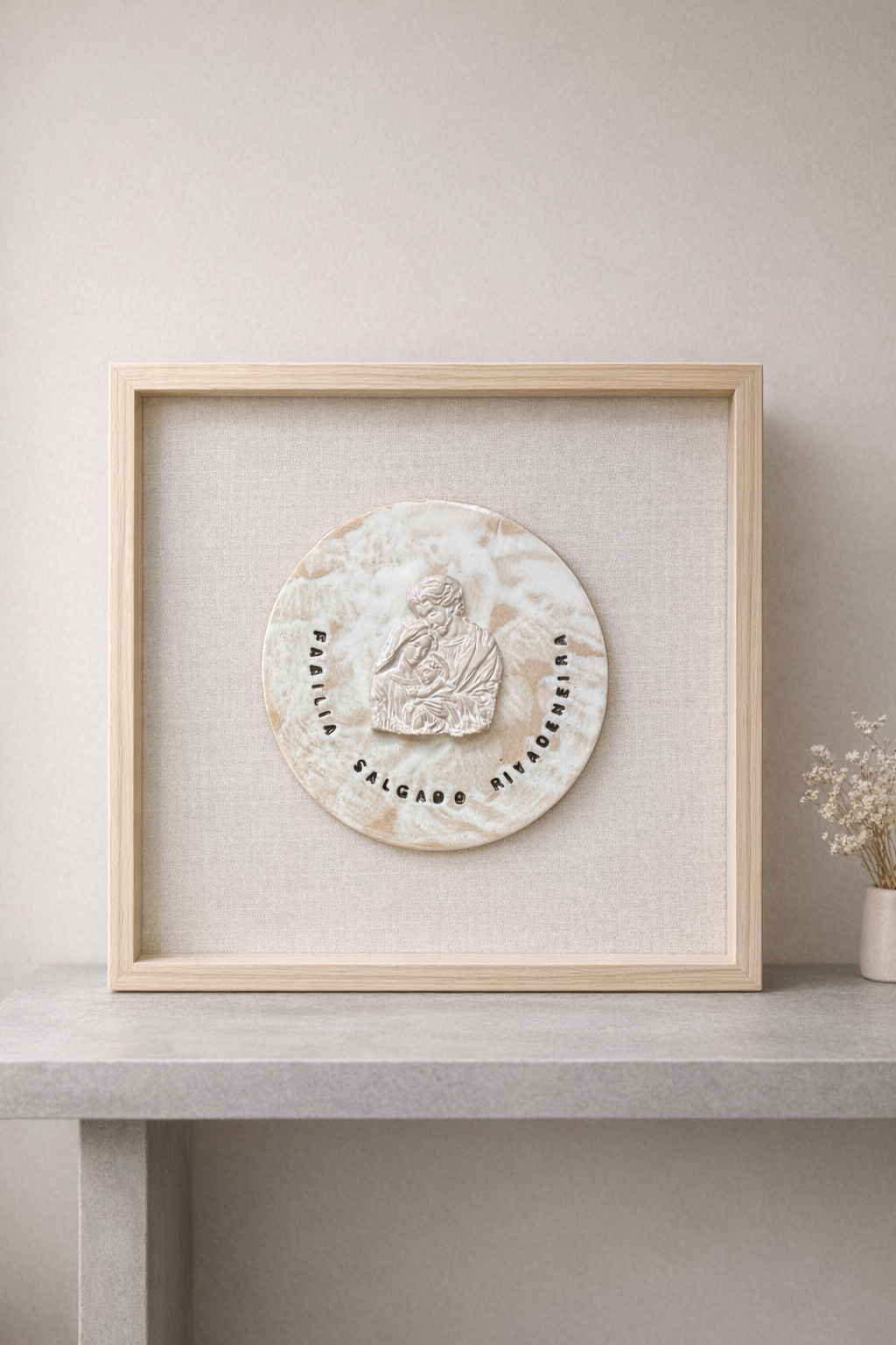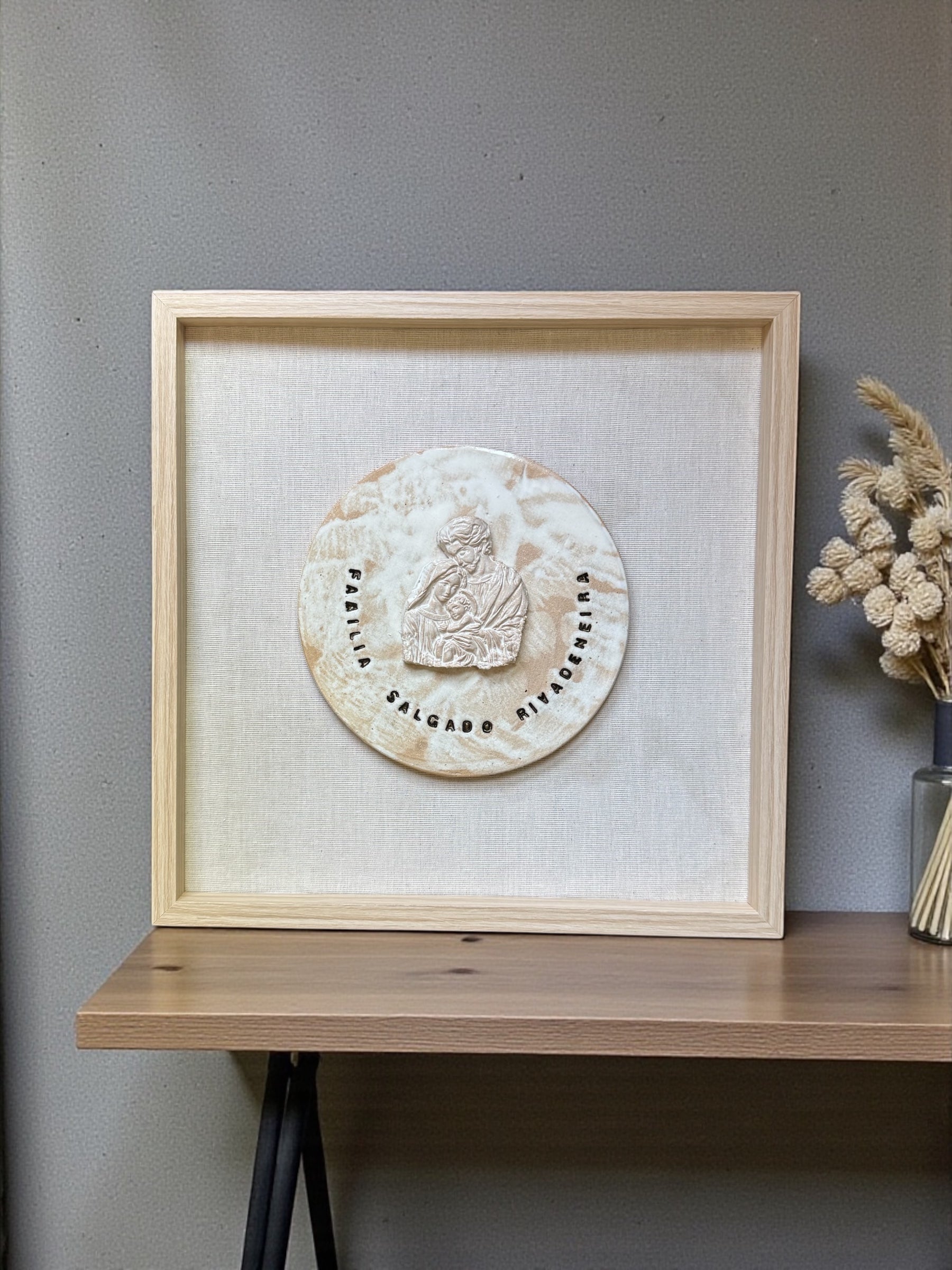 Un detalle único para tu hogar o para regalar. Cada cuadro incluye una figura de cerámica gres hecha a mano sobre fondo de lino beige, logrando un estilo simple y elegante que combina con cualquier espacio.