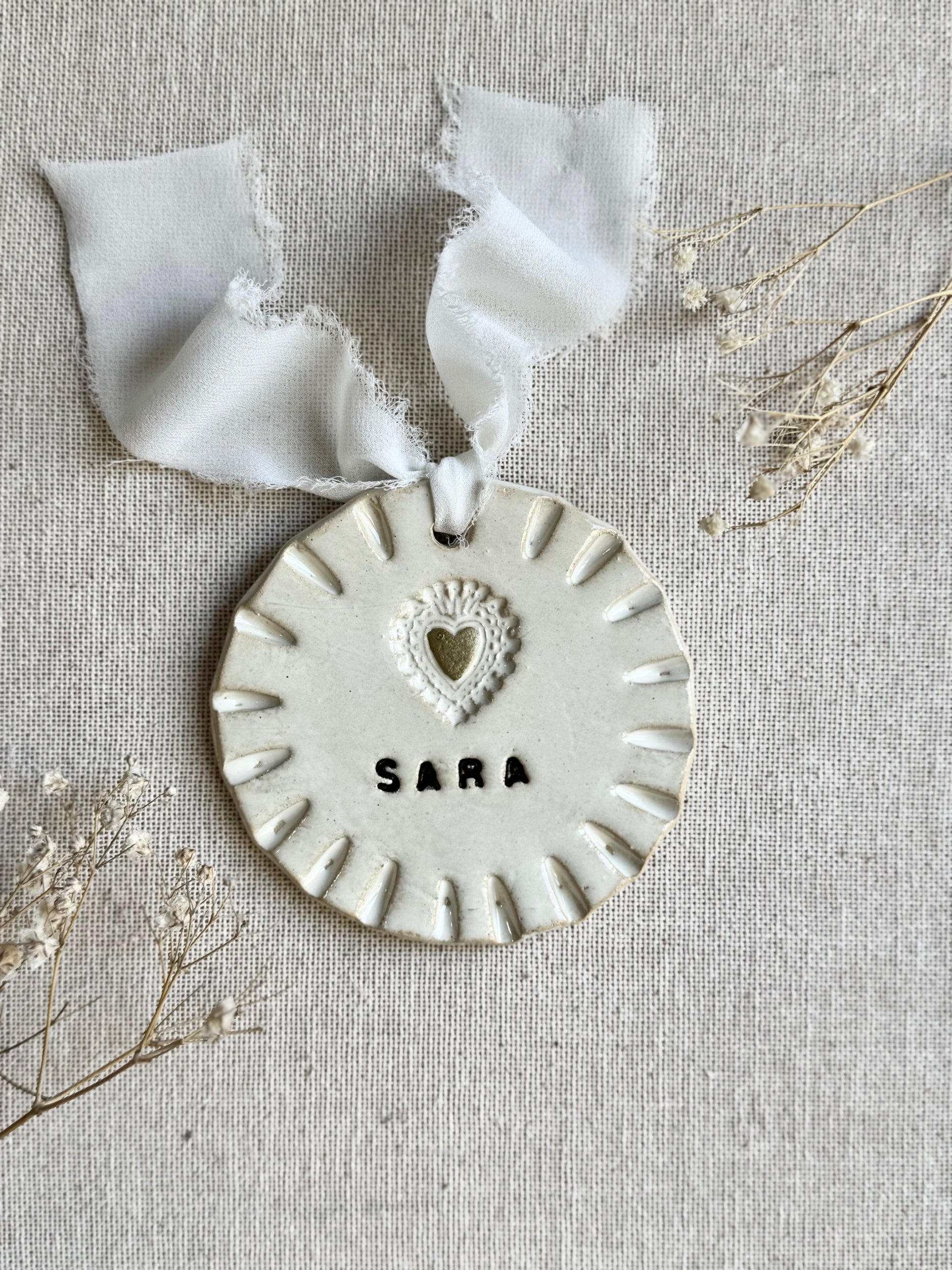 Mide aproximadamente 10 cm de diámetro e incluye una cinta para colgar, ideal para decorar o regalar.