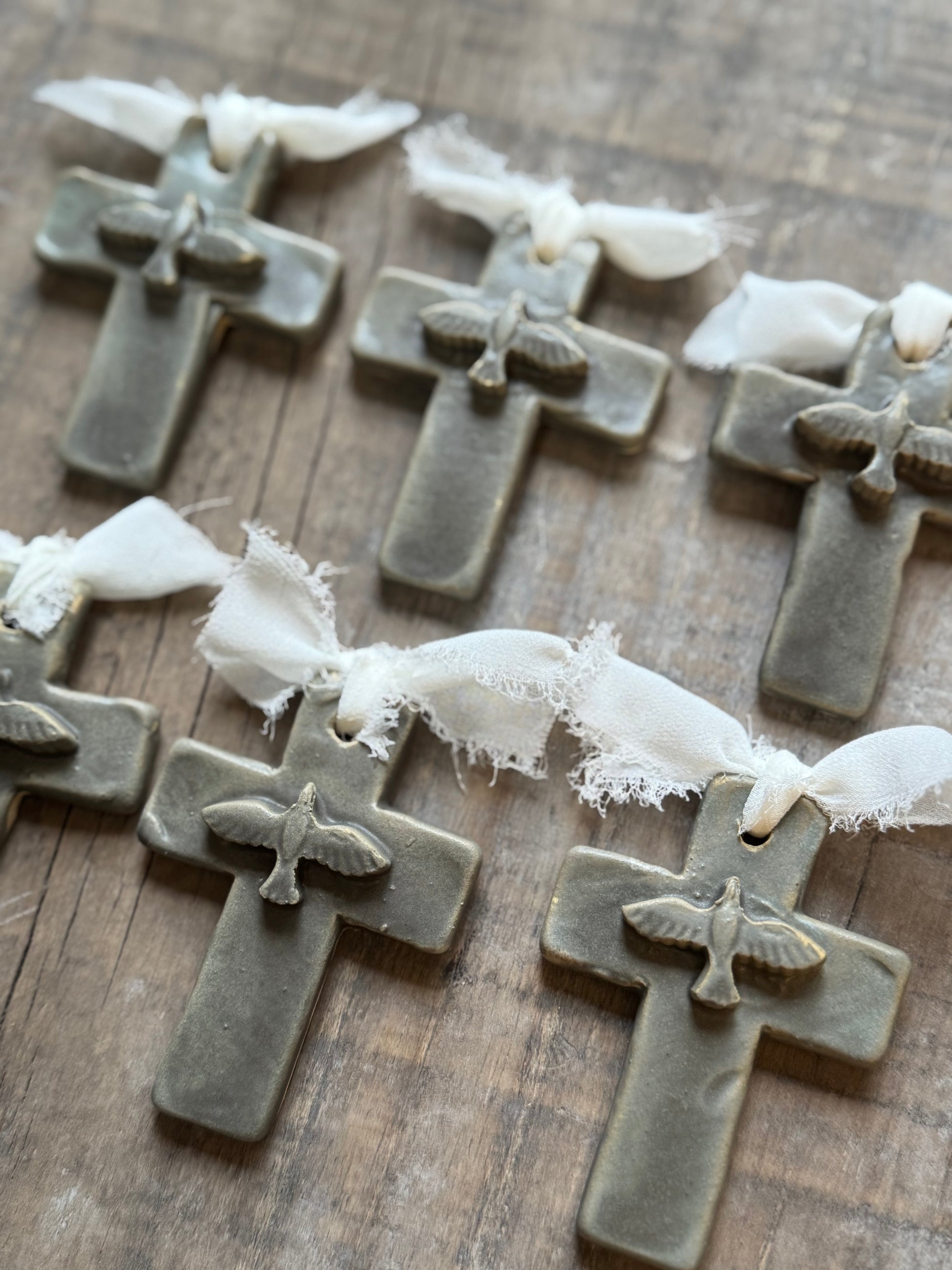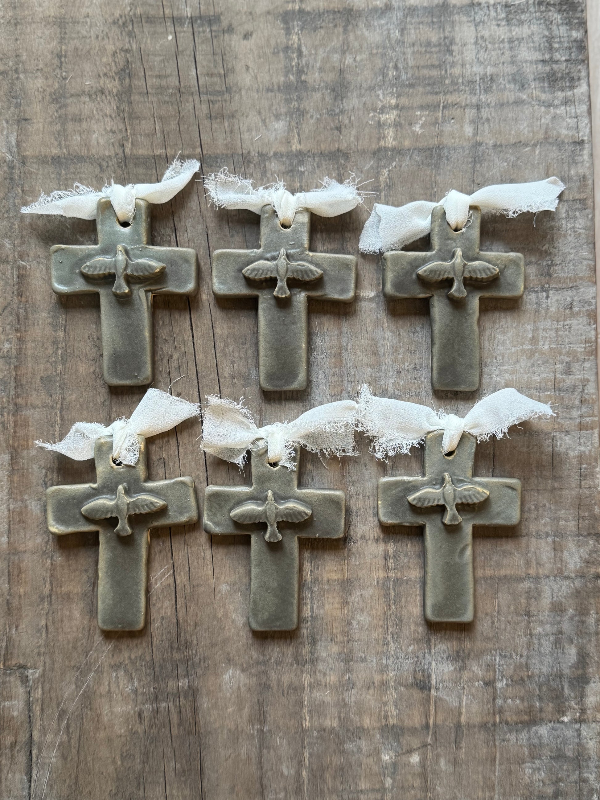 Cada cruz mide aproximadamente 8 cm e incorpora una cinta deshilachada, lista para regalar o utilizar en distintas ocasiones especiales.